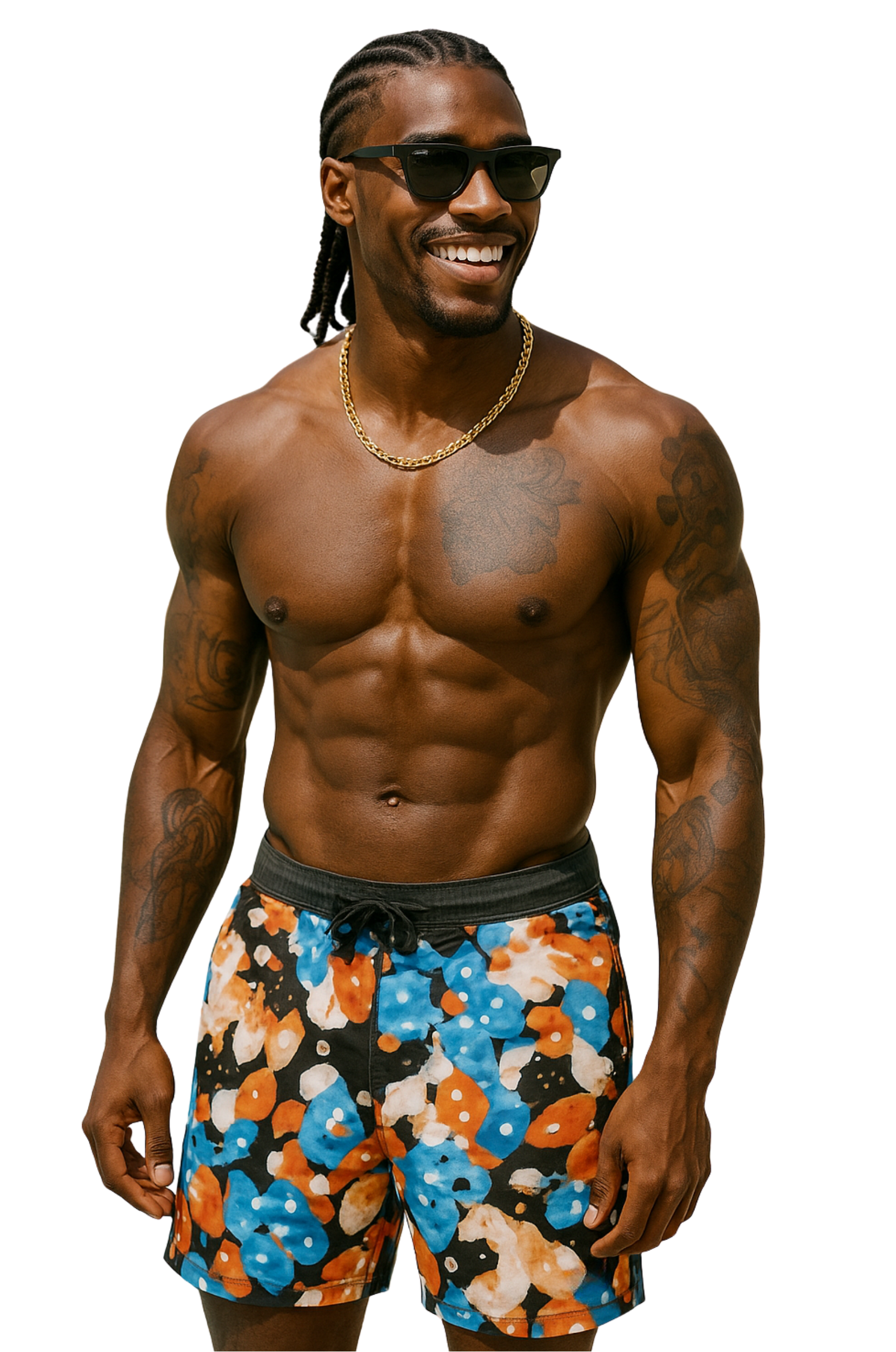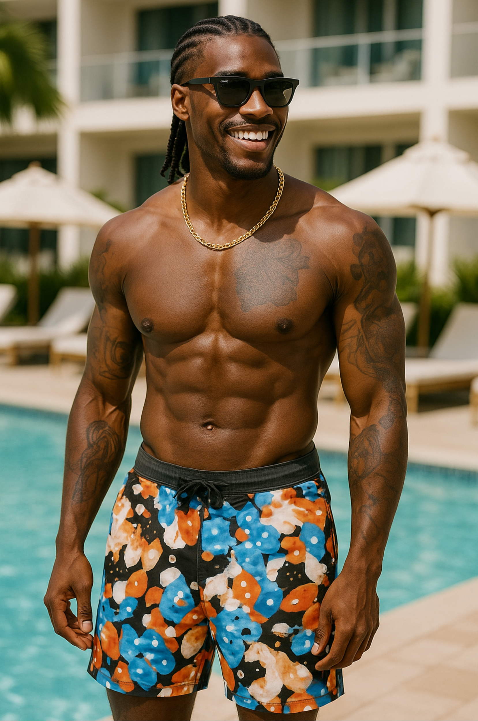 Turn heads with our Abstract Splash Swim Shorts, featuring a striking blue, orange, and white splash print over a sleek black base. Made with quick-dry fabric, a secure drawstring waistband, and a versatile mid-length cut, these shorts deliver both comfort and style for every summer outing.