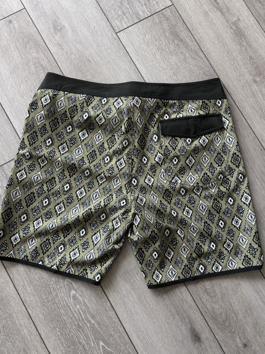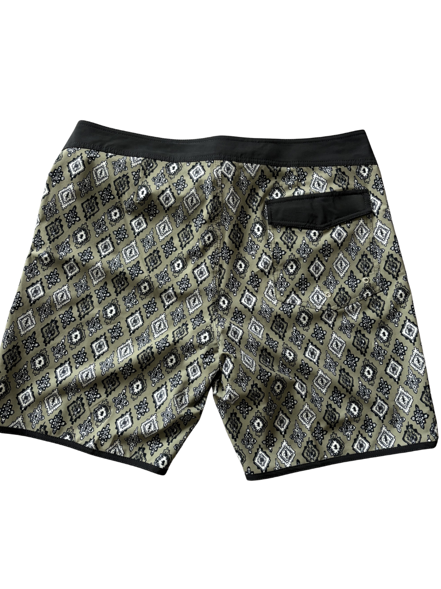 Kaiven’s Aztec Diamond Swim Shorts bring together timeless design and everyday functionality. Featuring an intricate black-and-white Aztec-inspired print on an olive base, these shorts are crafted from quick-dry, lightweight fabric for ultimate comfort. A tailored fit, secure waistband, and practical back pocket with flap closure make them ideal for both water and lifestyle wear.