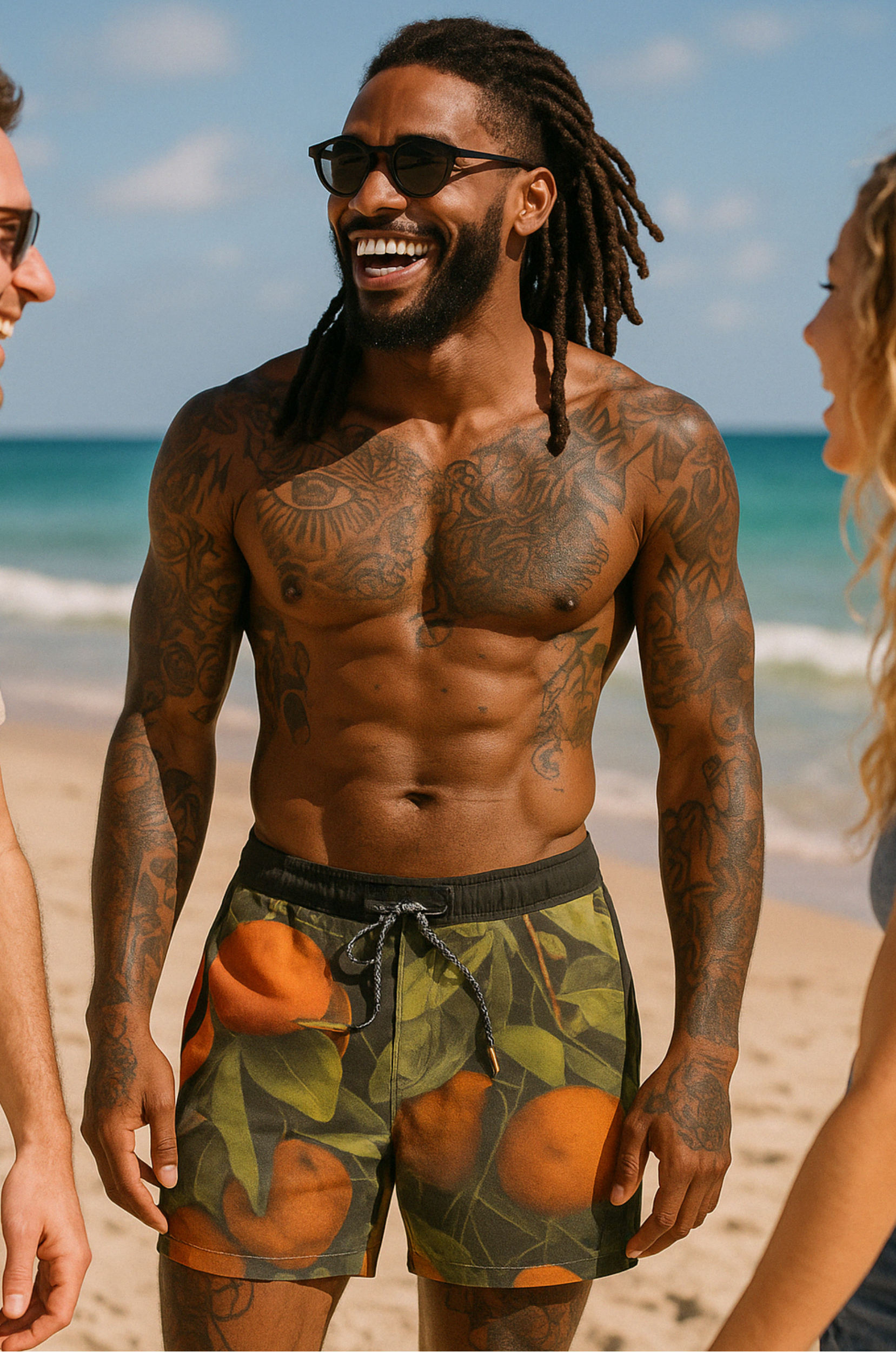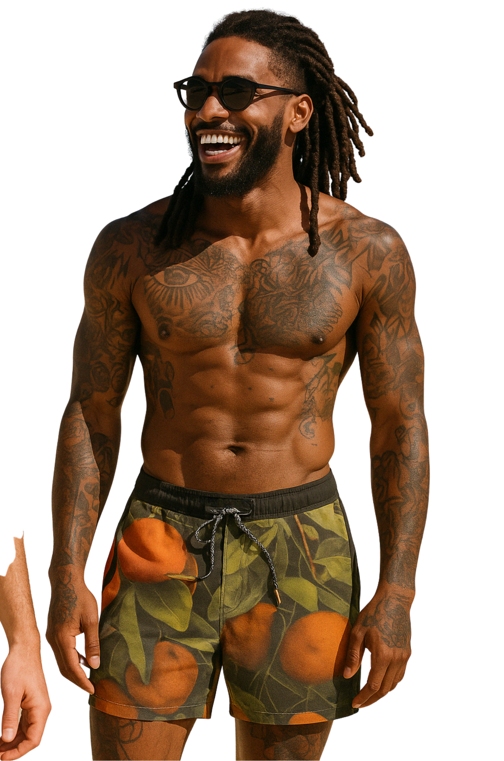 Infuse your swimwear with a burst of freshness in Kaiven’s Citrus Grove Swim Shorts. Featuring vibrant orange fruit motifs layered over lush green foliage, these shorts bring playful energy with a luxury edge. Crafted from lightweight quick-dry fabric and designed with a mid-length tailored cut, they’re perfect for resort escapes, poolside lounging, or tropical adventures.