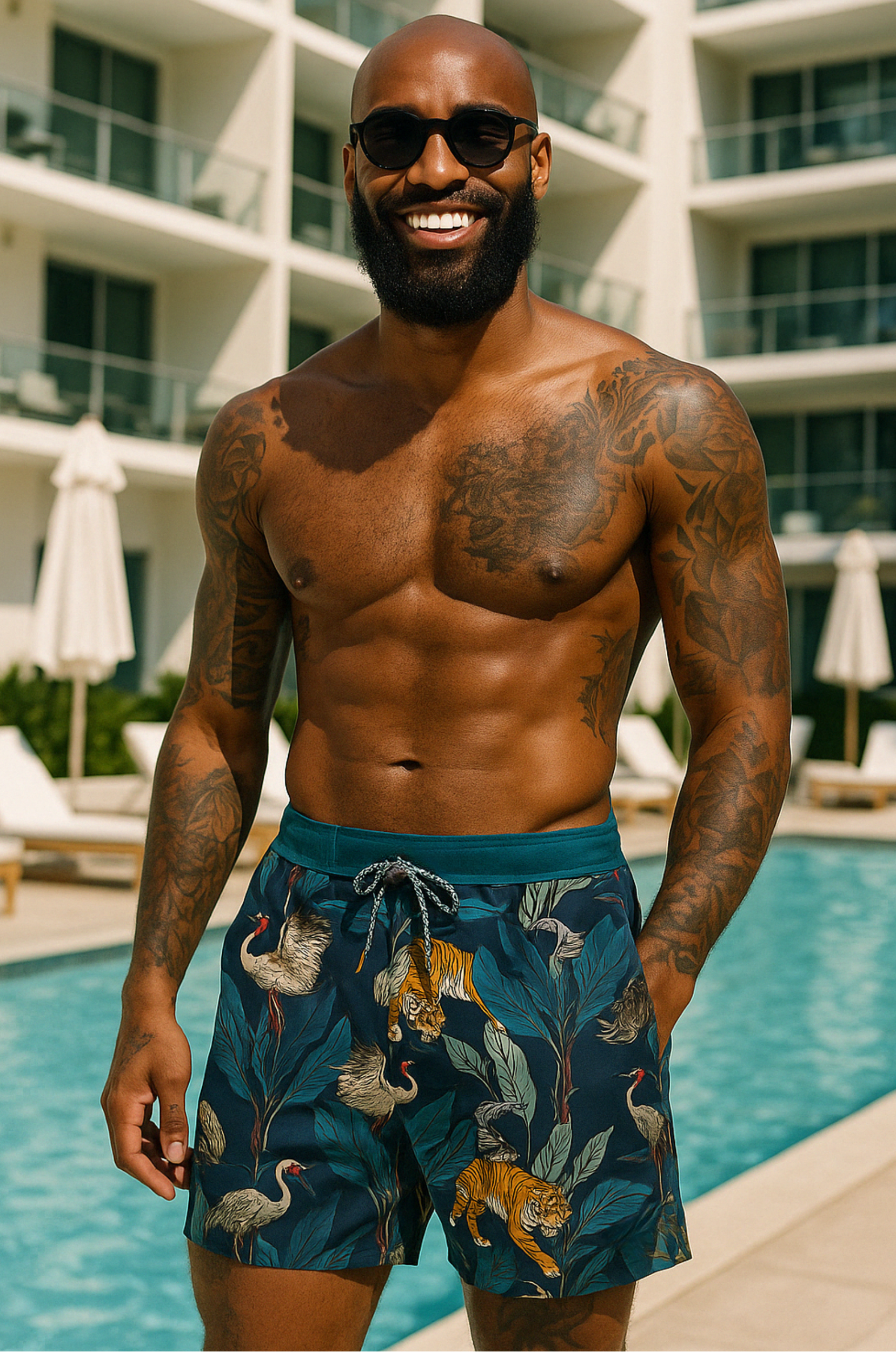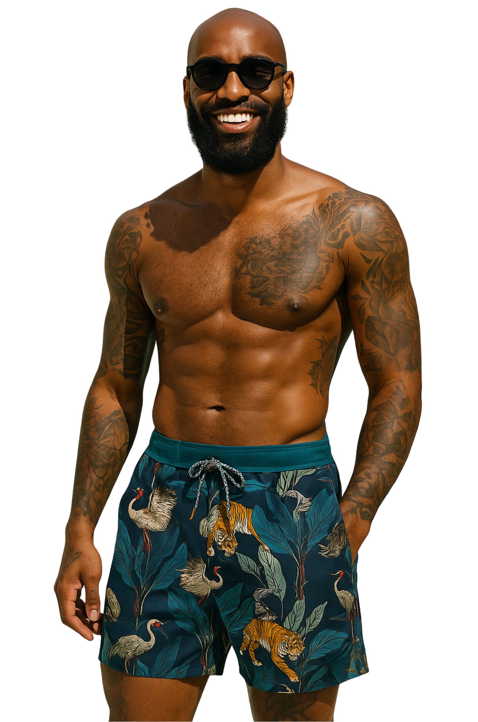Step into the wild with our Jungle Royale Swim Shorts, crafted for those who carry adventure in their soul. Featuring a deep emerald base adorned with majestic tigers, cranes, and lush tropical foliage, these shorts are the perfect mix of boldness and elegance.