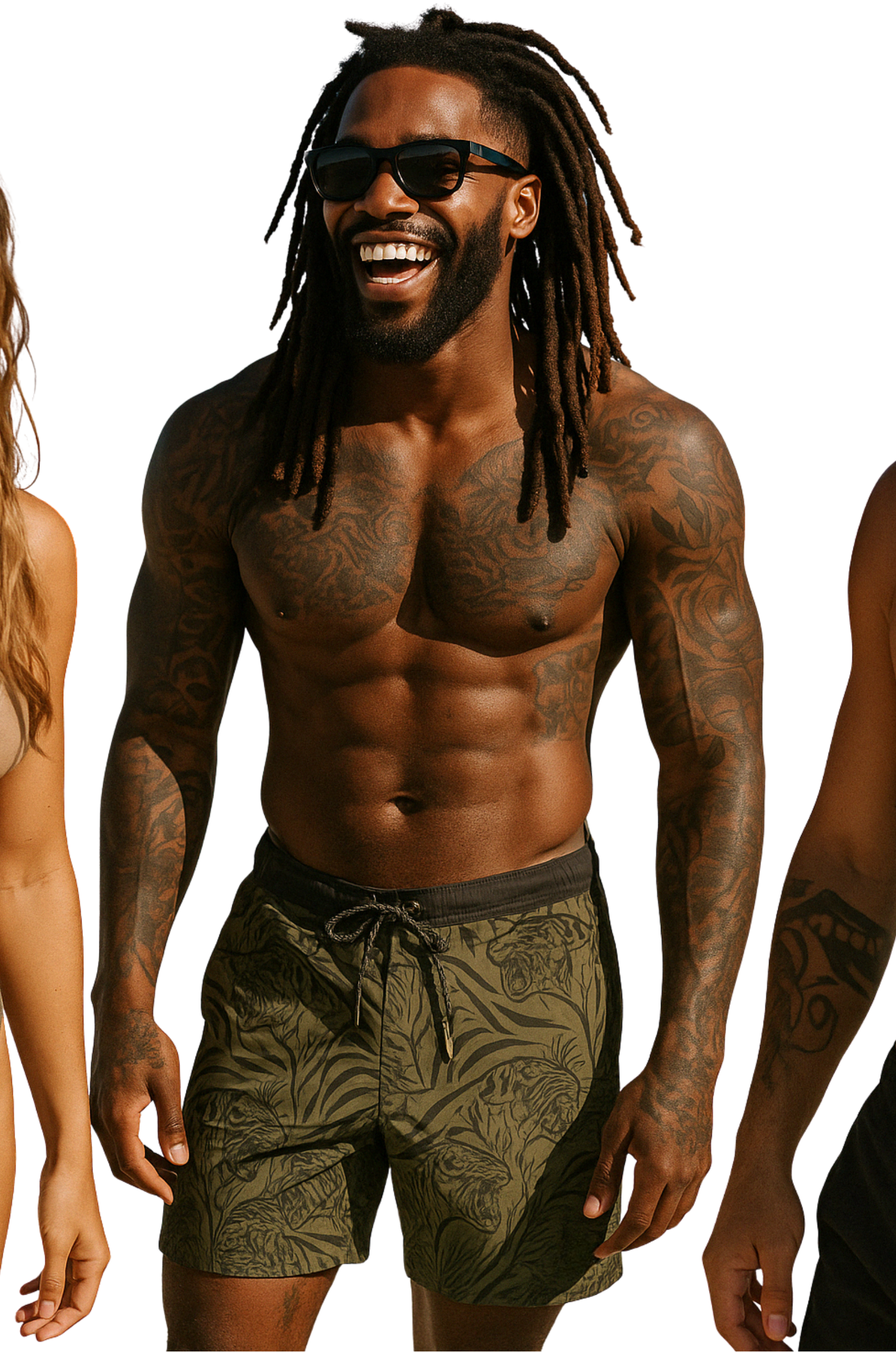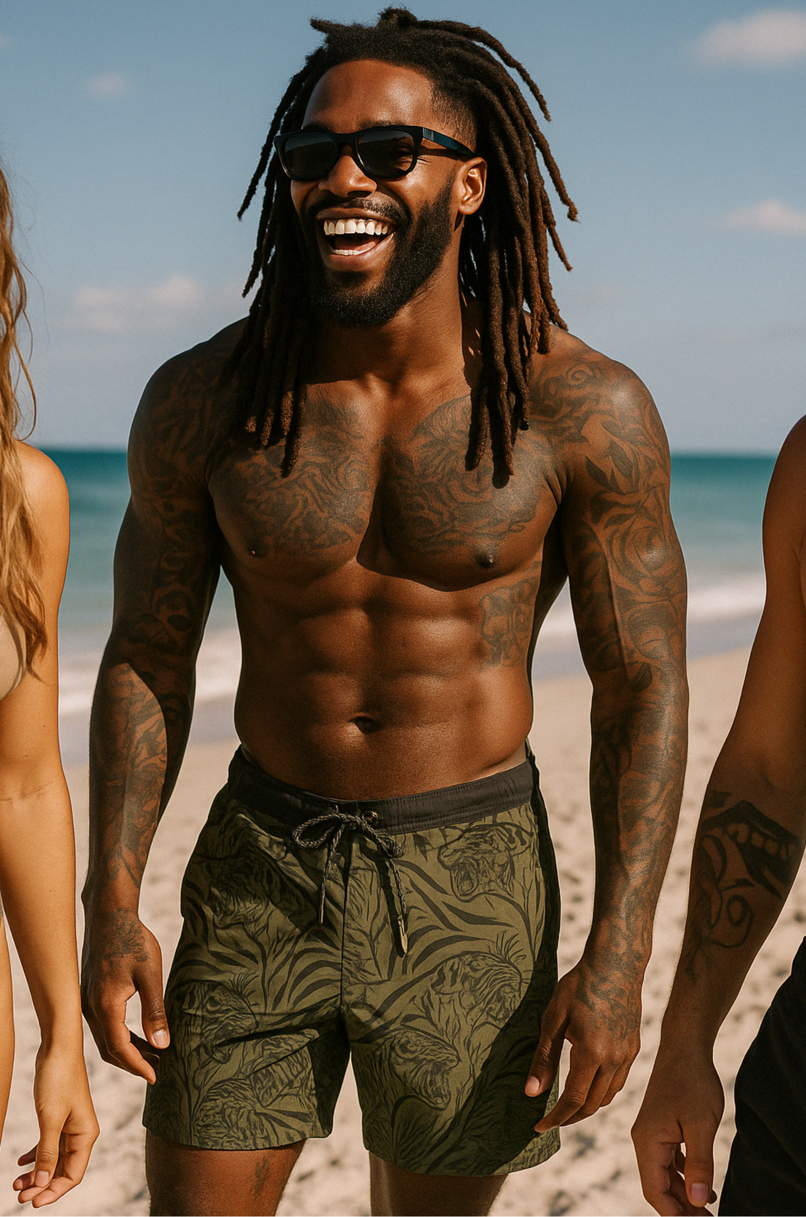 Tap into wild elegance with Kaivenโs Jungle Spirit Swim Shorts, featuring an olive-green base with tonal jungle foliage and hidden tiger motifs. Designed from lightweight quick-dry fabric with a tailored mid-length cut, these shorts deliver understated style with adventurous energy.
