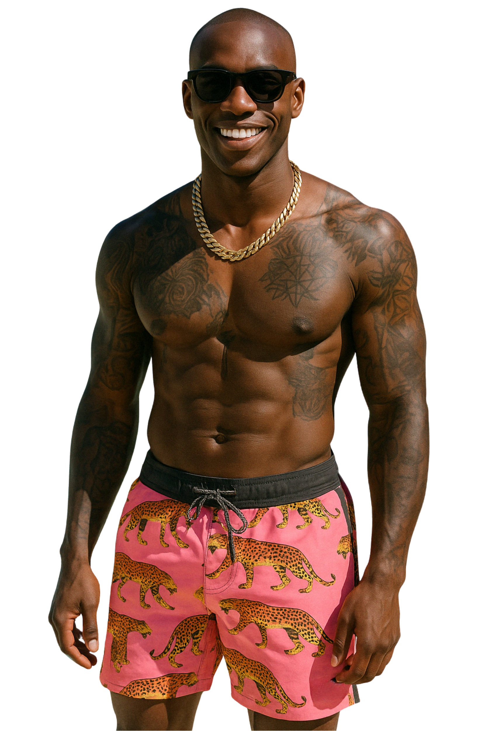 Stand out in fearless style with Kaiven’s Leopard Parade Swim Shorts, featuring a vibrant flamingo-pink base covered in bold golden leopard motifs. Crafted from lightweight quick-dry fabric with a mid-length tailored cut, these shorts bring luxury energy to beach days, pool parties, and tropical escapes.