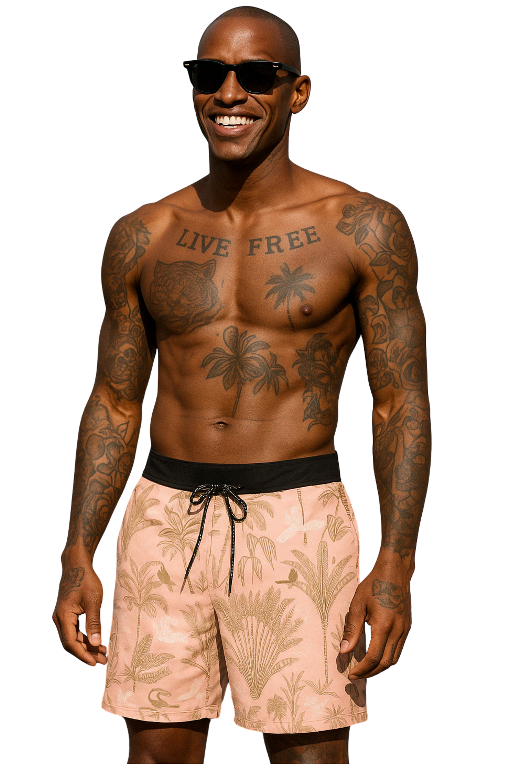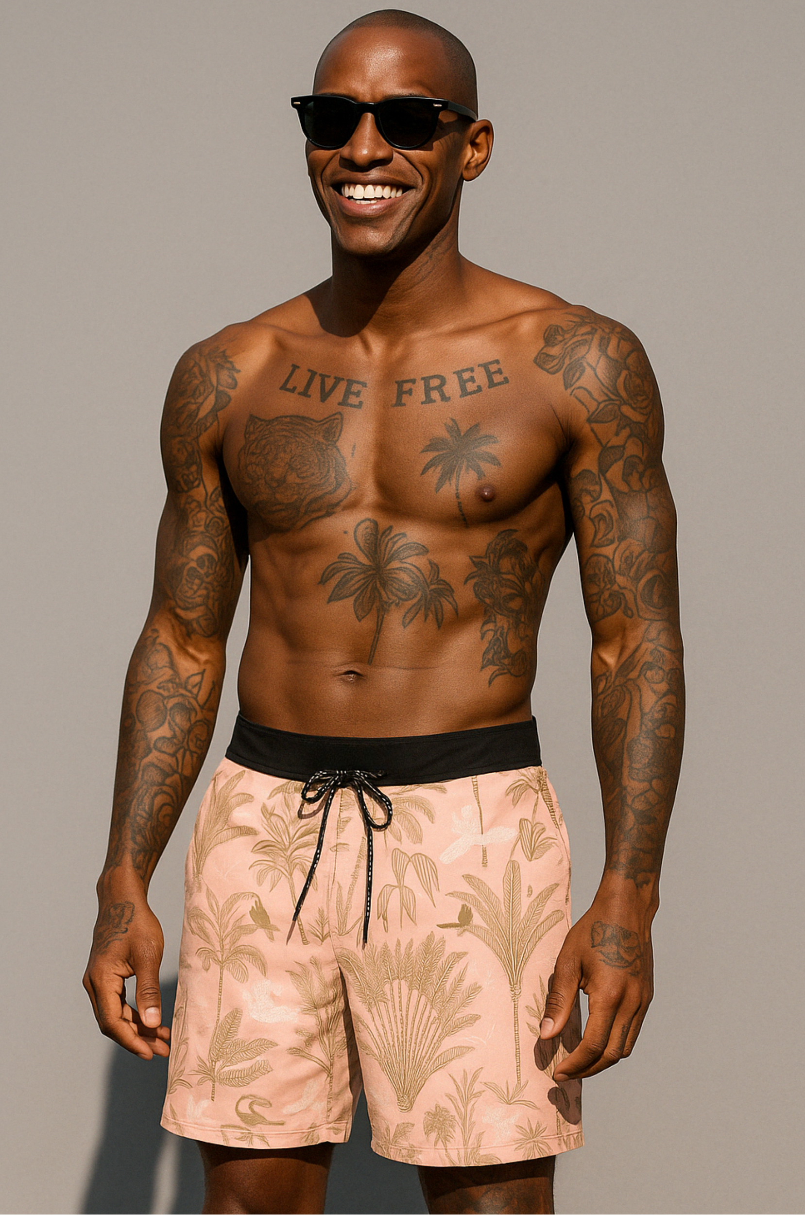 Relax in style with Kaivenβs Palm Paradise Swim Shorts, featuring a blush-pink base with delicate palm and tropical bird motifs in subtle gold tones. Designed in lightweight quick-dry fabric with a tailored mid-length cut, these shorts deliver effortless elegance and everyday comfort.