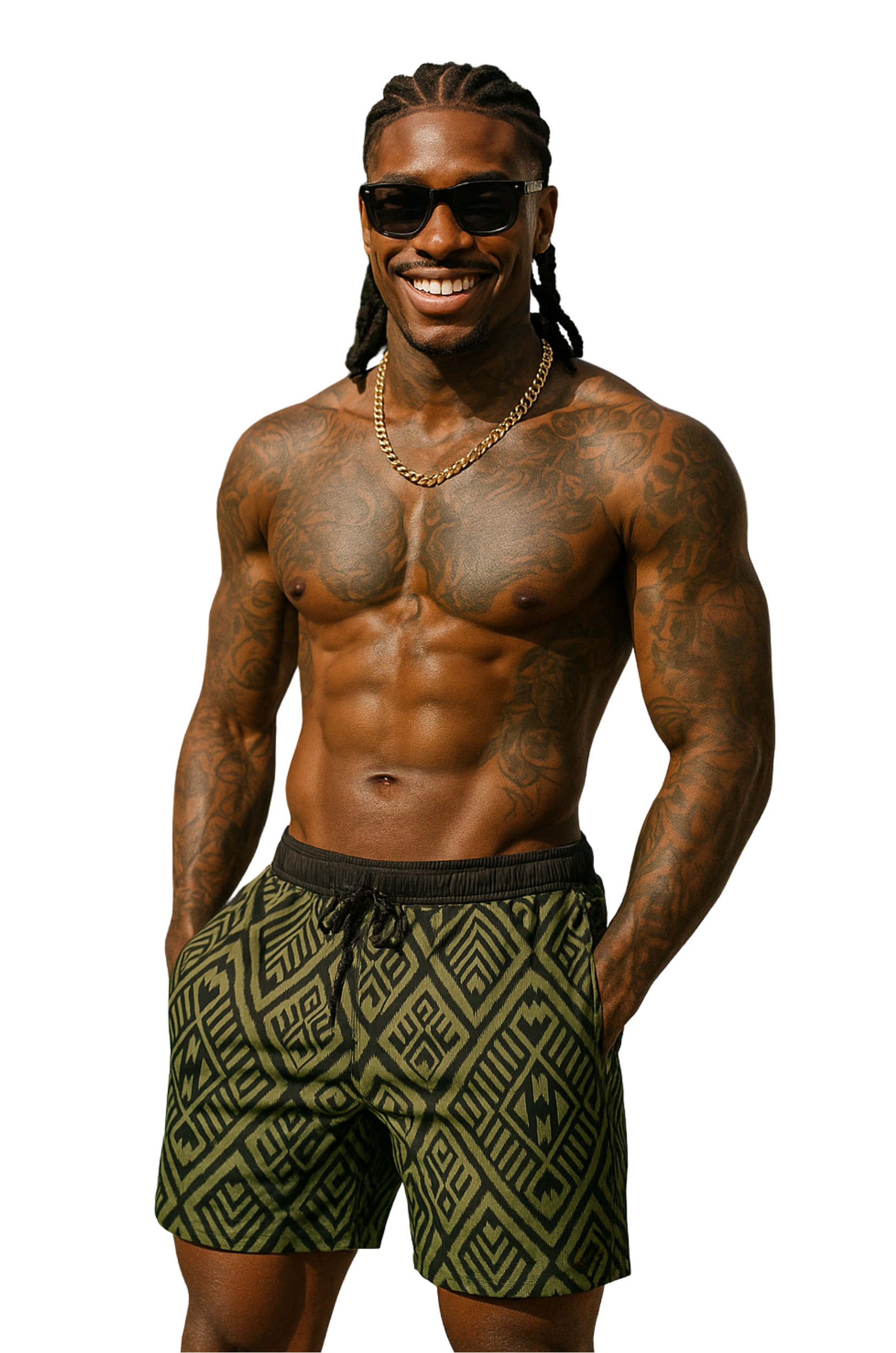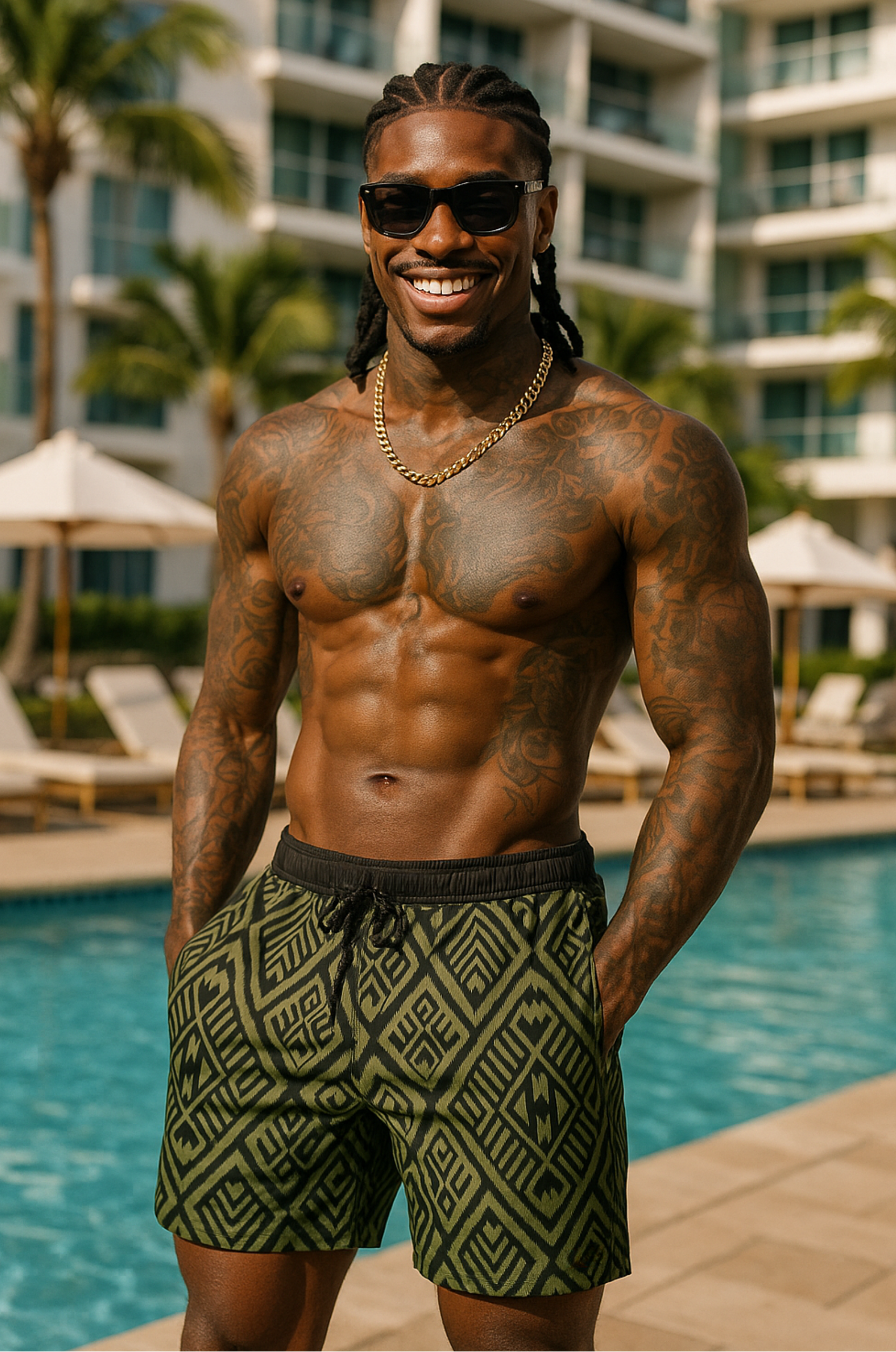 Bring out your bold side with the Tribal Green Geometric Swim Shorts, designed with an earthy green base and striking tribal-inspired motifs. Perfect for men who want their swimwear to make a fearless statement.