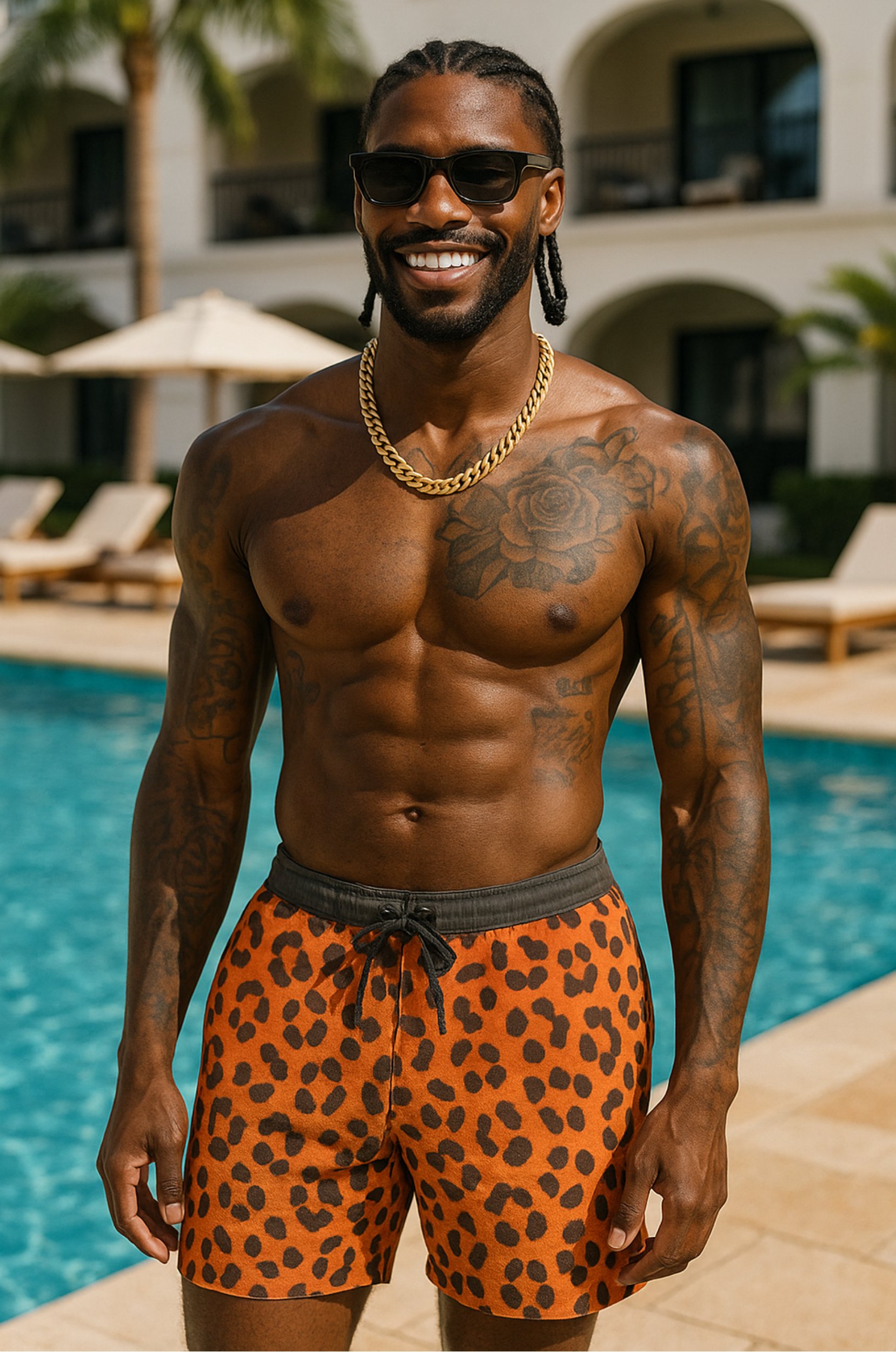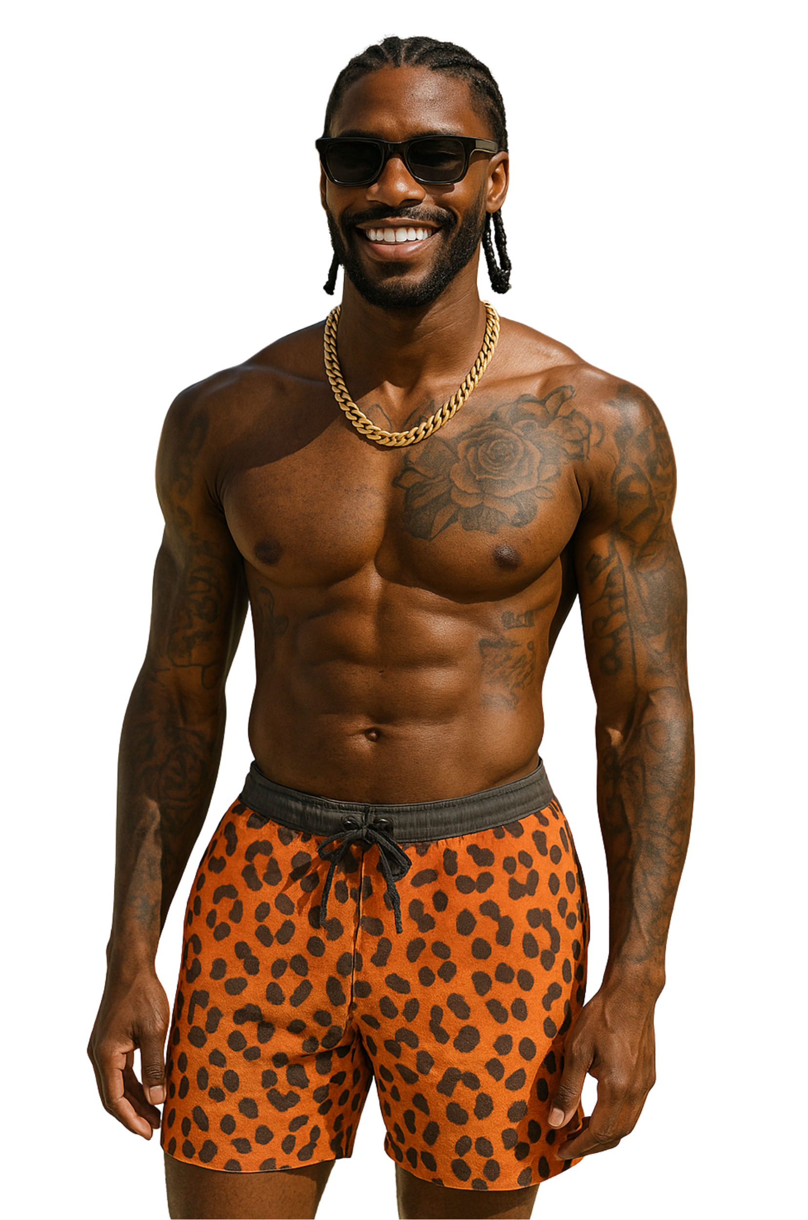 Turn up the heat with Kaivenβs Wild Leopard Swim Shorts, featuring a fiery ember-orange base with sleek black leopard spots. Crafted from lightweight quick-dry fabric and cut in a tailored mid-length fit, these shorts deliver maximum comfort with untamed style.